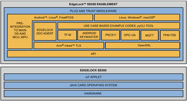 Of course, these two methods of defense require that encryption keys are kept safe from hackers and that algorithms are immutable. Fortunately, hardware security coprocessors exist for this very purpose, and a good example of such a device is the EdgeLock SE050 by NXP. This coprocessor integrates true random number generation, relies on multiple encryption algorithms including AES, RSA, and DES, can be used to store keys, and supports trusted platform module capabilities (Figure 2).
