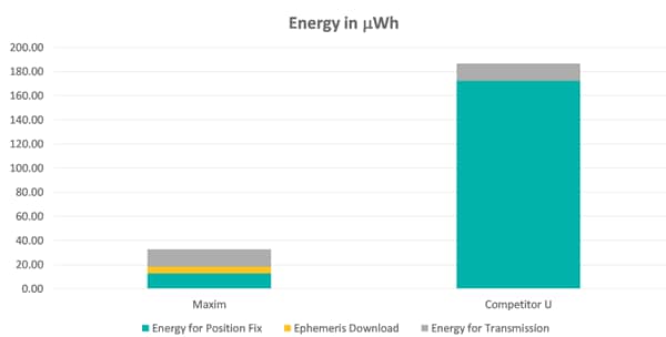 Table 1 compares the energy usage of the Maxim/BTI GPS solution to a commercially available low-power receiver module to illustrate the power savings that the snapshot receiver delivers. Both receivers are turned on hourly to receive the satellite signal, calculate the position and transmit their position wirelessly. The grey portion of the bars is the energy required by the wireless portion to transmit the position and is the same for both solutions. On the other hand, the energy required for the position fix and the Maxim system’s ephemeris download is less than 20uWh, while the competitor consumes 170uWh or nine times more energy.