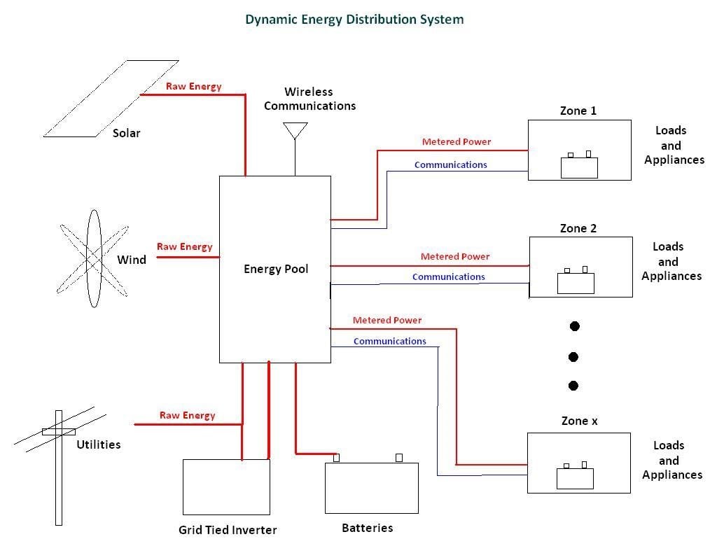 Figure 1: Energy from all sources is conditioned and sent to the Energy Pool, where it is metered and sent to any zone that needs or requests energy. Each zone has its own energy store that allows it to operate the zone for a short time until it measures the amount of current it needs and requests that amount of current from the energy pool. Local energy stores are recharged as well. Excess energy that is not needed can charge storage batteries, create hydrogen and oxygen, and provide power to the grid using standard grid-tied inverters. (Source: Author)