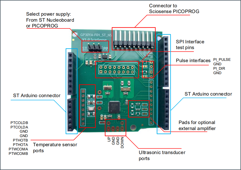 ScioSense UFC ST Nucleo Shields Expansion Boards can easily be combined with ST development kits and ScioSense evaluation kits. The boards feature two rows of connectors that fit into the ST Nucleo boards. An additional connector is available to use with the PICOPROG interface. Shields are available for TDC-GP30YA-F01 (with flow firmware), AS6031, and AS6040.Features